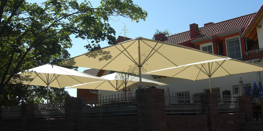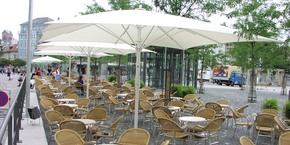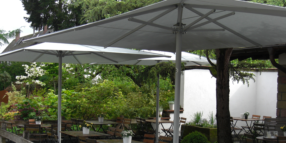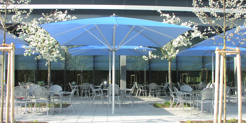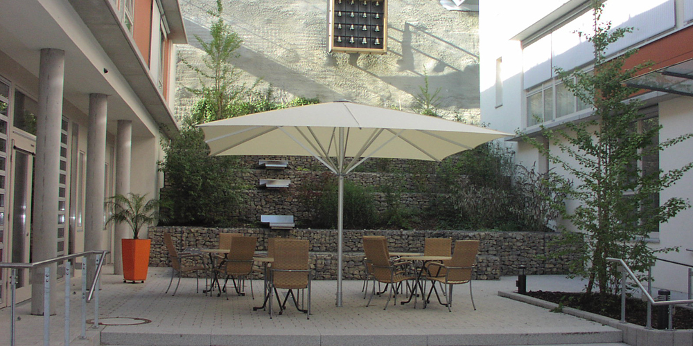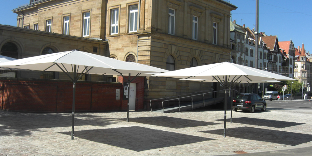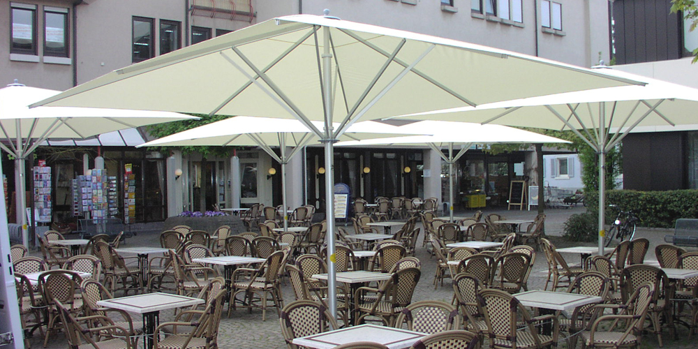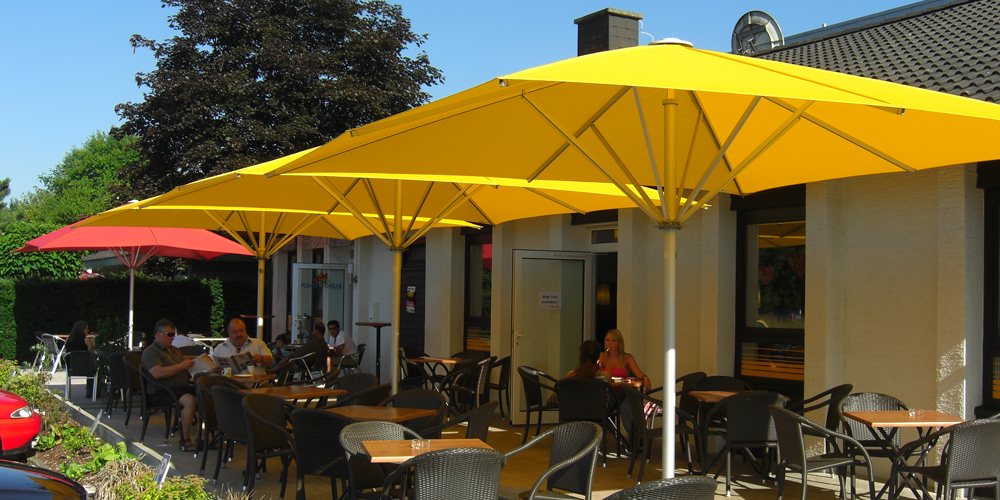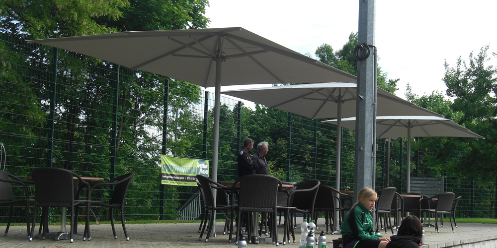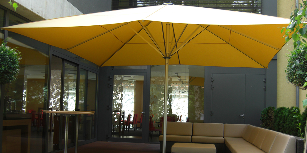 Alu-Schirmstock 76 mm Ø farbig beschichtet, mit abnehmbarer V2A-Handkurbel, Bezug aus Zeltwandstoff Airtex, ohne Volant, acrylat-beschichtet und wasserbeständig, Schirmmaß 500x500 cm